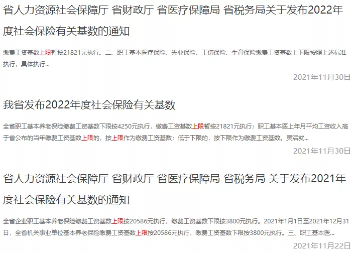 明确2022年1月1日至12月31日,全省职工基本养老保险缴费工资基数下限按4250元执行,缴费工资基数上限暂按21821元执行;职工基本医疗保险、失业保险、工伤保险、生育保险缴费工资基数上下限按照上述标准执行,具体执行时间由各设区市确定。